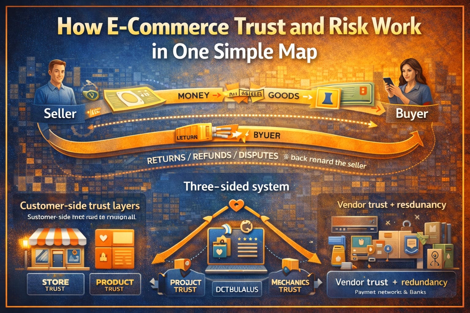 Customer-side trust layers (how the buyer decides to proceed): Layer 1: Storefront trust - what kind of store is this? Layer 2: Product trust - what am I buying? Layer 3: Mechanics trust - if something goes wrong, what happens next?